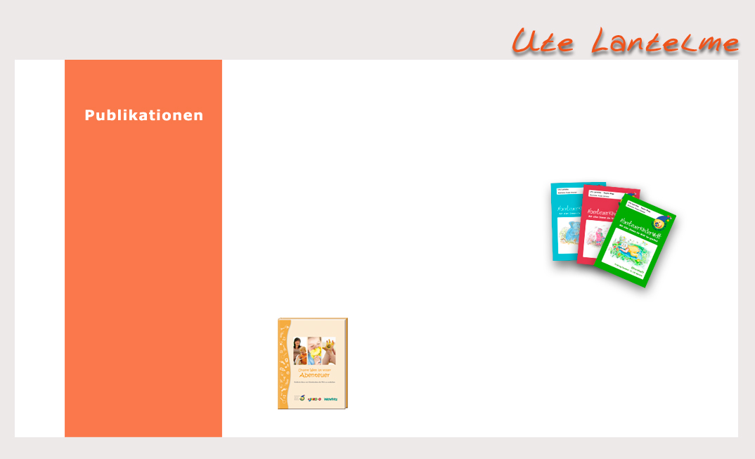 Veröffentlichungen von Spielideen für Kleinkinder - mehr Infos unter: (www.abenteuerkinderwelt.de) Mal- und Klanggeschichten, Finger-, Körper-, Wahrnehmungs- und Bewegungsspiele: Elternhefte AbenteuerKinderWelt • Einstieg in die AbenteuerKinderWelt • E1 Herbst/Winter • E2 Herbst/Winter • E3 Herbst/Winter • E4 Frühling/Sommer • E5 Frühling/Sommer • E6 Frühling/Sommer CD “Zauberhafte Musik” - Hörproben DVD “Es krabbelt hier und zappelt dort”, erhältlich bei JAKO-O |